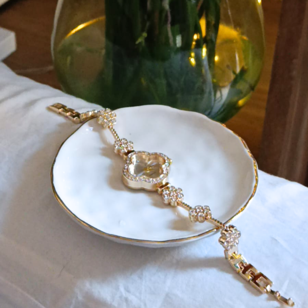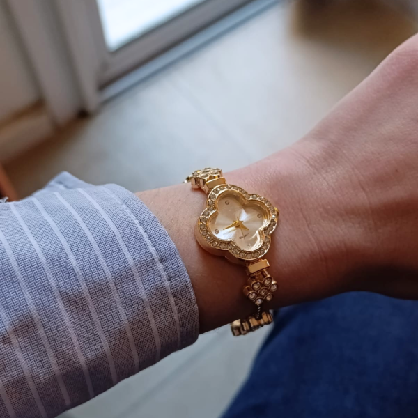 Clásicos y atemporales. El reloj Lucky con base dorada y cubics - inspirada en el trébol de cuatro hojas, símbolo de buena suerte y belleza.